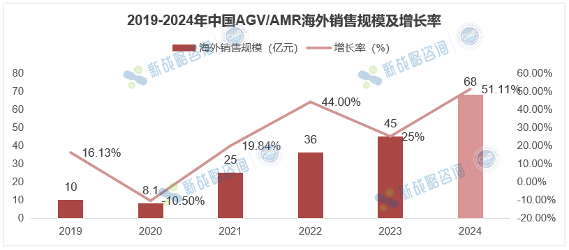 2024年,中国agv/amr企业海外销售规模为68亿,同比增长51.11%。在整体市场规模中占比为30.80%。国产agv/amr企业凭借高性价比尊龙凯时ag旗舰厅登录的解决方案和技术适配能力,在东南亚、欧美等市场实现规模化落地。